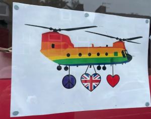 So in a 'thank you' to the RAF and its helicopter, residents and shopkeepers have started displaying posters featuring the Chinook image to recall and celebrate the way it helped the community pull together during the crisis.