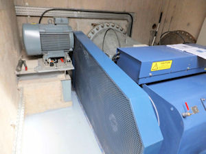 The turbine house is located largely underground by the lower lock and is connected to the intake by a 900mm diameter pipeline. This feeds into the turbine and the water drops through the floor of the turbine house through a draught tube where it joins the outlet of the main flood channel prior to rejoining the canal under the road bridge below the lower lock.