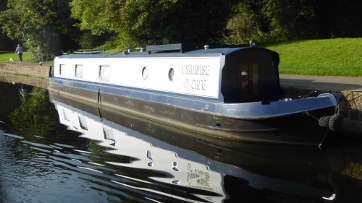 We had a little trouble at Birstall Lock as there was the boat Paradise Café well and truly moored right in the centre of the lock moorings—and seemingly permanent. Of course it was there to catch the walkers and cyclists, but surely it could have been at the end of the mooring, which would have made it easier for boaters. Here's a picture.