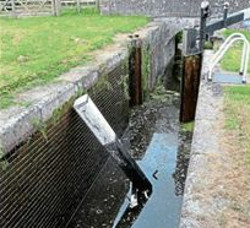A boater emptying one of the Belan Locks above Welshpool on the canal suddenly realised that its gate was falling off, and jumped quickly out of the way, then discovered that the collar holding the gate had been removed, so once the pressure of water holding it was released, the gate fell into the lock, Alan Tilbury tells us.