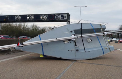 It was mayhem on the M25 motorway when a boat slipped from its trailer and landed smack in the middle of the anticlockwise motorway.