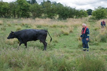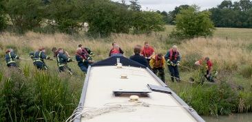 The Warwickshire Fire Brigade duly arrived and after surveying the scene, their chief (chap called Andy in a white helmet) radioed they would need to use their inflatable dinghy and also some of the crew should go to the off-side bank. We continued to hold the cow on the towpath side, although at times she seemed to want to swim back to the off-side, but was extremely exhausted.