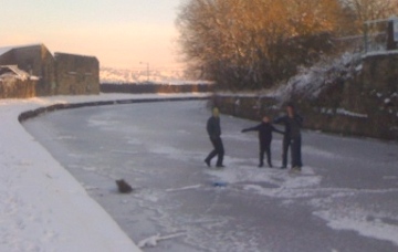 This picture shows youths risking their lives on the frozen Leeds & Liverpool Canal, despite warning of its danger, Alan Tilbury relates.