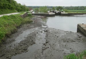 However, after two short flights of narrow locks, it is lock free for quite a while, but with druggies under the many bridges, and still no moored boats, it is wise not to leave a boat unattended in the area or moor overnight until reaching Catherine De Barnes, which is a relief, though there is a strong possibility of something being wrapped around the prop shaft, as can be seen.