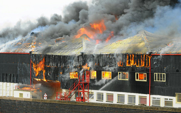 The roof of the large building collapsed as the whole area was on fire with 40 firefighters battling to not only stop the flames spreading to nearby premises, but to control potentially dangerous numerous gas cylinders from exploding.