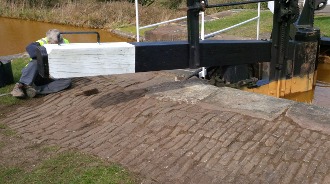 Restoration is certainly a challenge that will be pursued but improvement is more readily achievable. (The photograph shows vegetation cleared from cobble setts around other lock gates on the flight and the gates themselves given a fresh coat of paint, together with the associated lock furniture.)