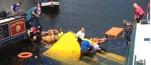 The narrowboat Predator and another narrowboat came to the rescue of the people in the water, pulling them onto their boats, and people on the walkways around the dock throwing life buoys for those struggling in the water.
