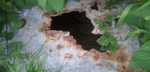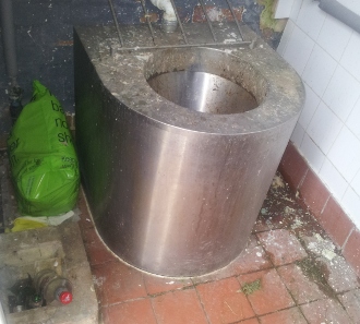The pan and building are not the worst aspect it's the sewerage cover outside. If you look closely you can see poo through the rusty hole in the cover. Surely a health and safety issue.
