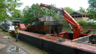 Once the boat was floating, straps were put under it and connected to the chains on the HiAb to lift it clear of the water. It was then swung over and onto the barge and taken away leaving the mooring clear for boats for the festival.