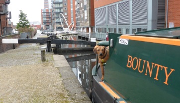 This meant that even with two passing boats coming down—also obviously having the gates open for us—we easily made it under one and half hours. Anyway let me introduce you to 10 months old Thomas's new Rhodesian Ridgeback, Rusty, on his maiden voyage, who didn't think very much of all that noise and the grass-less Birmingham. Those of you who met Red, his previous Ridgeback, alas his illness had the better of him.