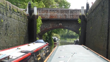 But much worse was to come when we found that there was no way any of the boats could exit the lock, even though one went right back under the 'waterfall' from the top gates. As very rightly pointed out neither of the two bottom gates would open fully, with at one time three of us giving our whole weight to each one. I mentioned to the others what Victor had written, so we had to give it up as a bad job. [The photograph is of two other much shorter boats that managed to exit, with one going right back.]