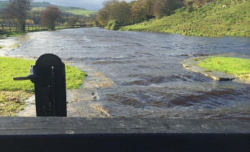 The build-up of debris at the weir at Linthwaite, that had not been cleared, has caused the water to back-up after the rain, and having nowhere to go it poured over fields and footpaths, but luckily no dwellings were flooded.