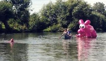 The idea of the giant pink dog is because the swimmers are using the 'doggy paddle' stroke which allows the head to be out of the water thus enabling them to chat to onlookers and passing boaters.