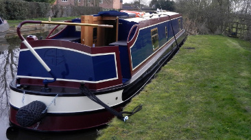 The boat is not sign written. It is 50ft narrowboat cruiser stern in dark blue, maroon and cream stripes and a cream roof. It has the Stenson logo SB laser cut into the steel.