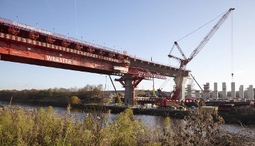 A massive bridge building machine has been brought in to construct the Mersey Gateway bridge over the canal that will connect the Central Expressway in Runcorn with the Eastern Bypass and Speke Road in Widnes, Alan Tilbury reports.