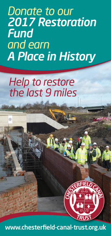 This can be done online at the Chesterfield Canal Trust's website or by cash or cheque sent to the Treasurer, Chesterfield Canal Trust, Hollingwood Hub, Hollingwood, Chesterfield, S43 2PF.